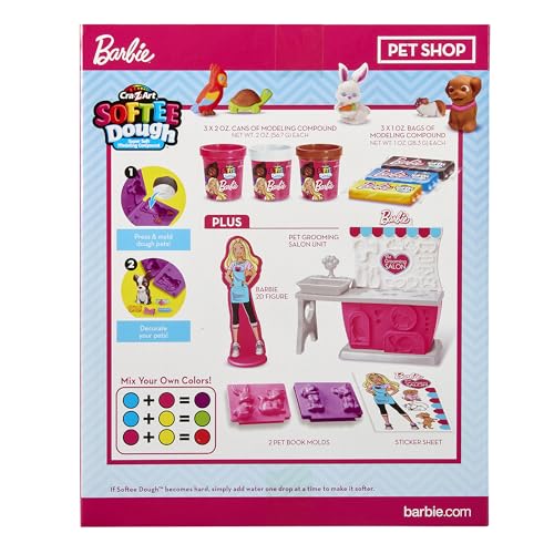 - استمتعي بمغامرات ممتعة مع مجموعة ألعاب باربي سوفتي دو بيت شوب، التي تأتي مع صالون عناية الحيوانات الأليفة مليء بقوالب الضغط لتشكيل الصلصال من الجهتين الأمامية والخلفية.