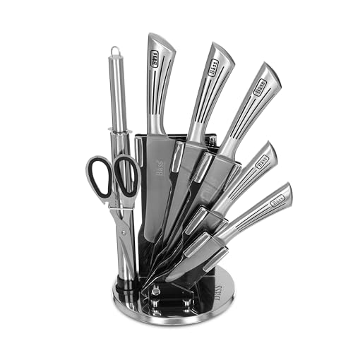 - مجموعة كاملة: مجموعة سكاكين مكونة من 7 قطع تتضمن سكين الشيف وسكين الخبز وسكين متعدد الاستخدامات وسكين تقشير ومقص مطبخ وقضيب شحذ وحامل عصري من الستانلس ستيل