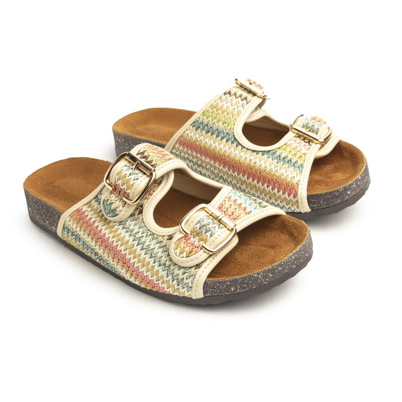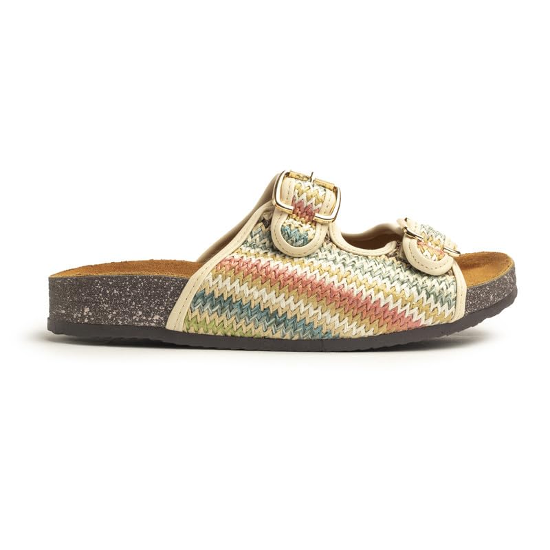 BASTET - BASTET "Hathor" Women's Flat Comfort Slides ? Dual Buckle Sandals with Multicolor Zigzag Weave ? Fun & Soft Footbed - size