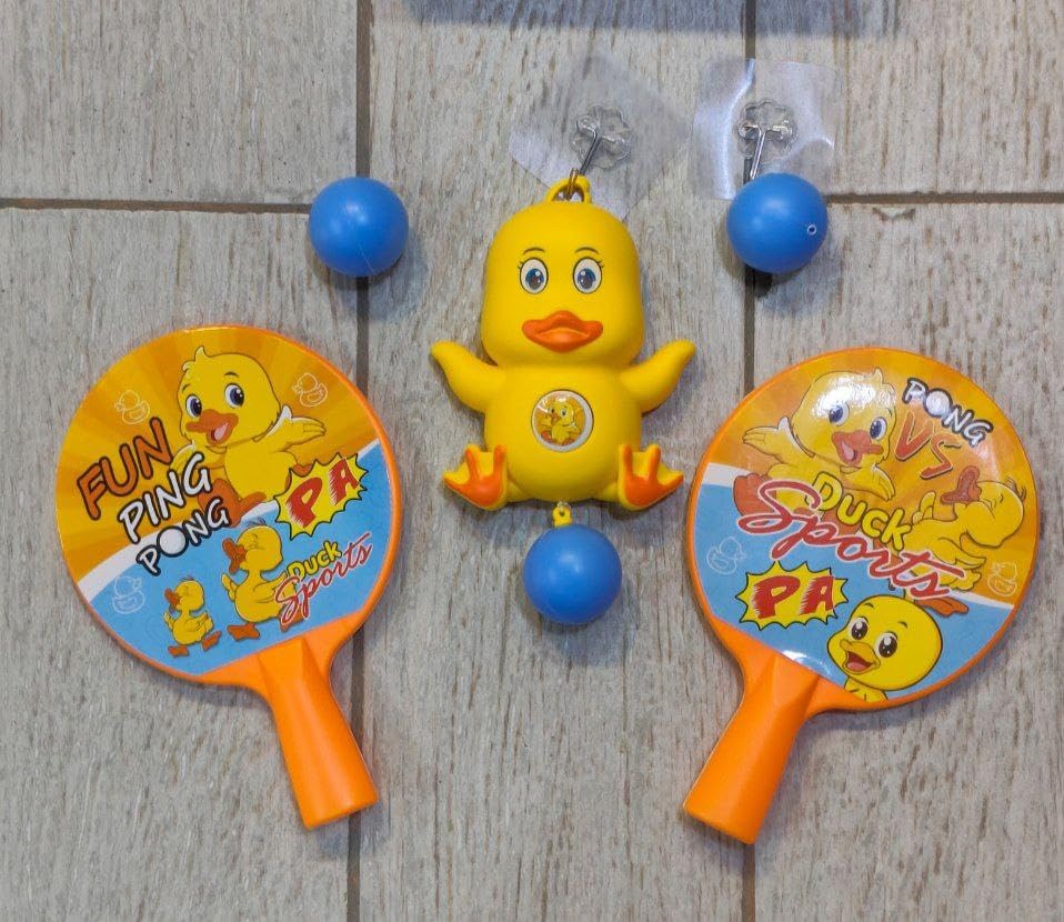 - محتويات المجموعة: تتضمن اللعبة بطة صفراء معلقة، مضربين ملونين، كرتين زرقاوات، وخطافات للتثبيت على الحائط لتجربة لعب تفاعلية كاملة