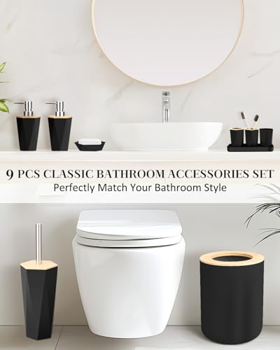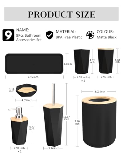 Sino Salected - Bathroom Accessories Set, 9Pcs Plastic Bathroom Accessory Set with Trash Can, Toilet Brush Set,Toothbrush Holder, Toothbrush Cup, Soap Dispenser, Soap Dish, Cotton Ball Holder(Black)