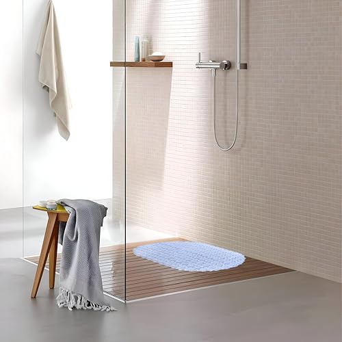 - Comfort underfoot with gentle pebble massage: raised nodes soothe tired feet, while flexible, comfortable material stays flat without curling. The frosted, grippy texture adds cushioned traction for confident footing during showers or baths.