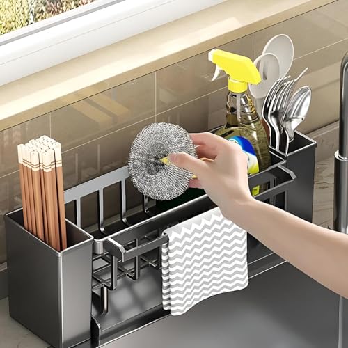 - This kitchen sink organizer features an automatic drain design cleverly integrated into its base, allowing excess water to flow directly into the sink without manual emptying, keeping your workspace dry and mess-free.