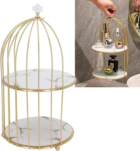 - This product features a distinctive golden birdcage frame design, adding a luxurious and artistic touch to any room; its elegant appearance makes it perfect for displaying cosmetics, jewelry, or small decorative items, elevating your space's aesthetics.