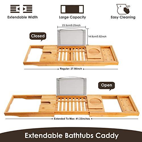 KOCASO - Bathtub Caddy Tray, Bamboo Bath Tray Table Extendable Reading Rack Tablet Phone Holder Wine Glass Holder Shelf Desk Bathroom Spa