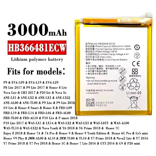 Generic - بطارية ليثيوم أيون بوليمر بديلة جديدة 3000 مللي أمبير/الساعة HB366481ECW متوافقة مع موبايل هواوي P9/p9 لايت/هونر 8/p10 لايت/p8 لايت 2017/p20 لايت/p9lite