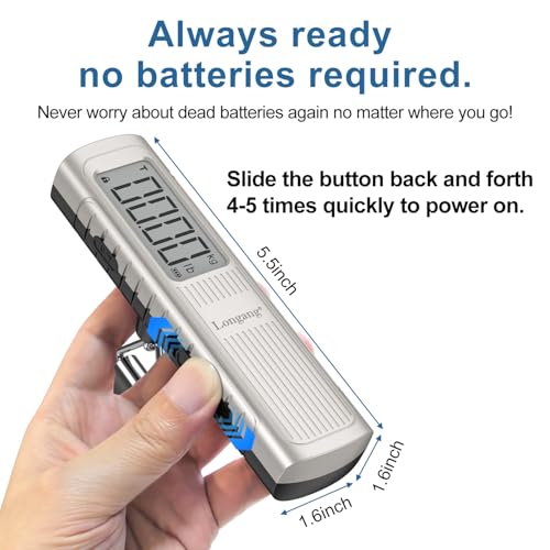 - No Battery Required – Eco-friendly and hassle-free operation without the need for batteries or charging, just simply slide the pushbutton 4-5 times quickly to generate power for the hanging scale, no need to replace batteries or worry about disposing of used batteries, ensuring reliable use anytime, anywhere. No worrying about running out of batteries on vacation!