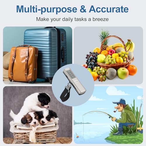- Precise & High Capacity – Accurately measures weights up to 110lbs/50kg with a resolution of 0.1lb/50g. Never pay overweight baggage fees again! T-handle design hanging scale with durable nylon strap and sturdy metal hook, perfect for luggage, packages, backpacks and more. It is also suitable for buying groceries in markets and as a fishing scale.