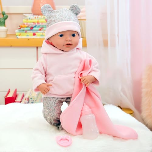 - ترتدي عروسة الطفل ملابس متقنة مع طاقية مطابقة.