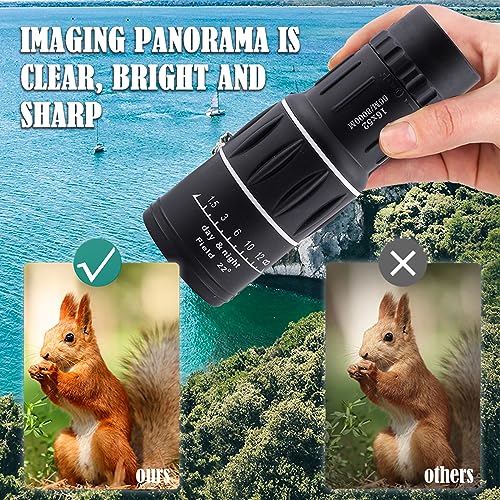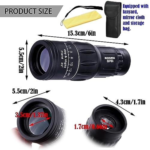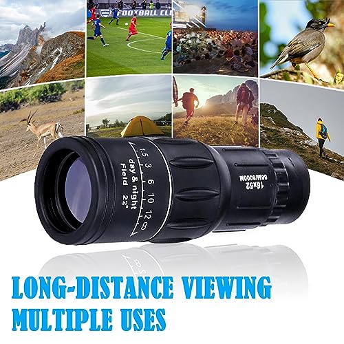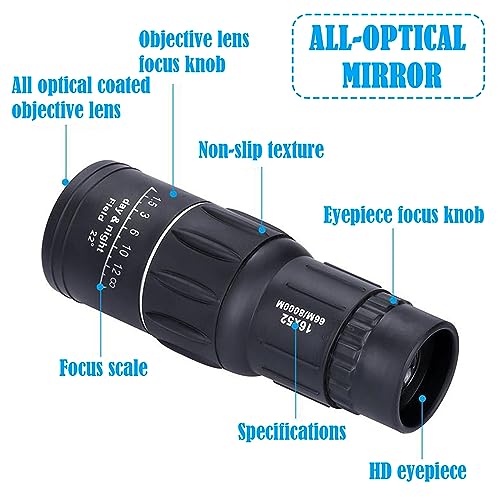 - 【16X52 HD Monocular Telescope】High performance monocular telescope, high definition and super bright vision, clear vision in low light conditions. Perfect for hiking, hunting, climbing, bird watching, ball games, concerts, wildlife and landscape watching.