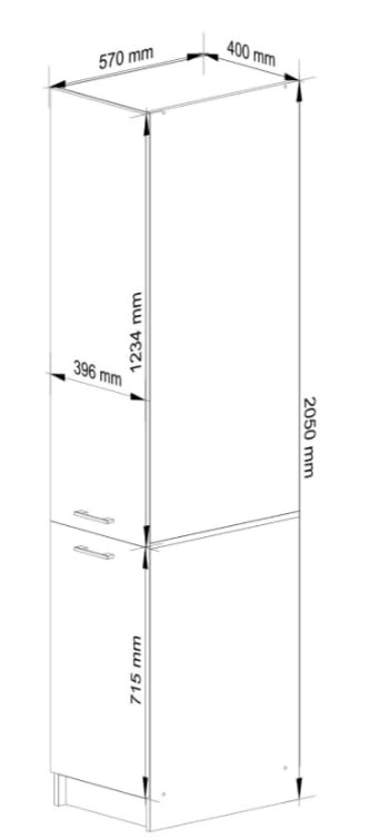 - Product features: Dimensions: Width: 40 cm, Height: 205 cm, Depth: 57 cm, Material: 16 mm laminated board, Thickness of the plate: 16 mm. Product weight: 48.4 kg. Number of doors: 2 Self-assembly furniture.