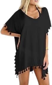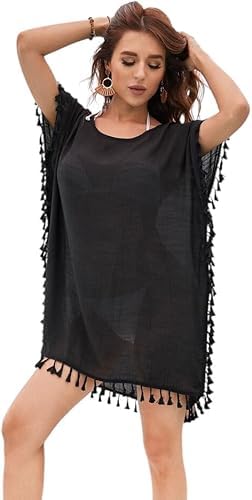 Generic - فستان للشاطئ مع حواف بشراشيب، اسود، قصة فضفاضة بنمط قفطان، مقاس واحد