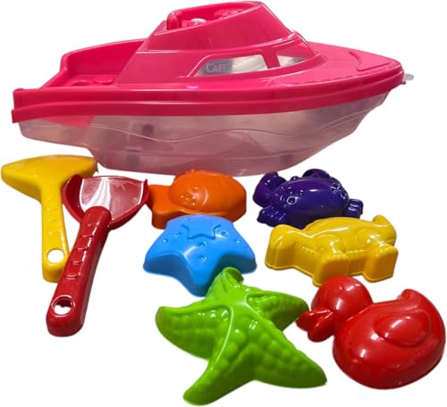 - COMPLETE SET: Includes a large pink boat, sturdy shovel, and 8 vibrantly coloured sea animal-shaped sand moulds for endless beach fun