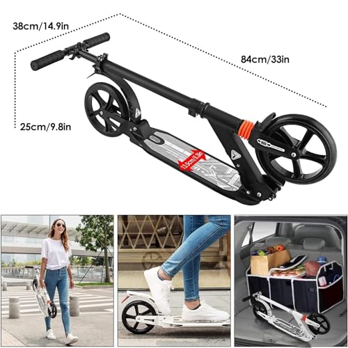 - سهل الاستخدام والحمل - لا يتطلب السكوتر خفيف الوزن أي تجميع، حيث يكون جاهز للركوب مباشرة بمجرد إخراجه من الصندوق. كل ما عليك فعله هو فتح الأنبوب على شكل T، وضبط الإرتفاع على المقود القابل للتعديل، وتثبيته والانطلاق بعيدًا. عملية الطي سهلة للغاية ولا تحتاج إلى أدوات! هذا السكوتر مثالي لحزمه في السيارة وأخذه إلى أي مكان أثناء التنقل. وهو ما تبحث عنه تمامًا!
