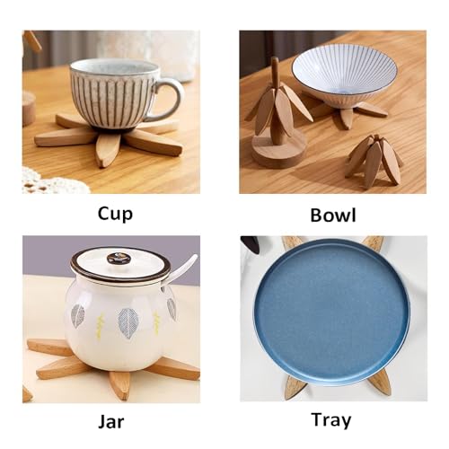 - 【Multi-functional Use】The heat-resistant wooden triangular stand unfolds to 7.8 inches and can hold cups, bowls, plates, teapots, frying pans, and hot pots, suitable for tabletops of different materials such as glass, marble, and wood, and can be placed in various scenes such as kitchens, living rooms, and dining rooms