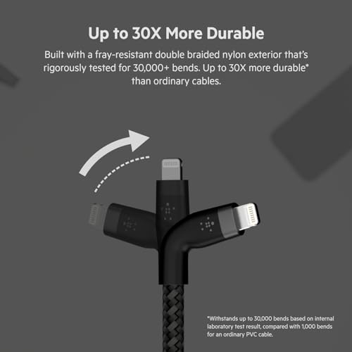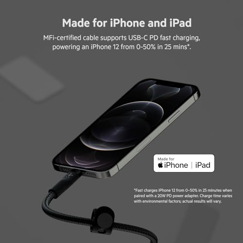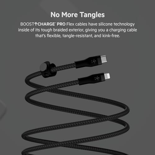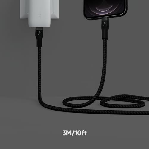 Belkin - كابل بوستشارج فليكس المجدول بمنفذ USB-C الى لايتنينج للشحن السريع من بلكين معتمد ابل لموبايل ايفون 13 و12 و11 وبرو وماكس وميني وSE واي باد وغيره الاجهزة 3 متر/10 قدم - اسود