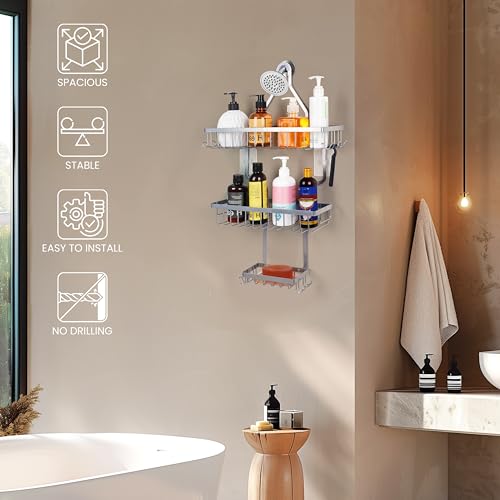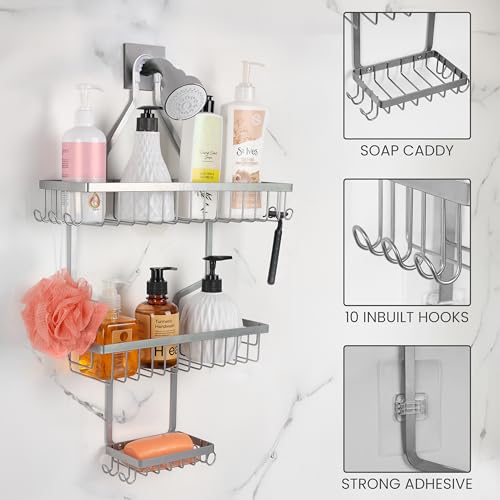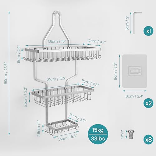 - 3-TIER ORGANISER CADDY: Organise your bathroom essentials with this 3-tier over-head silver shower caddy. The holder measures W38 x D12 x H60cm (15 x 4.7 x 23.6 inches). Our shower rack features 3 storage baskets and 10 hanging hooks.
