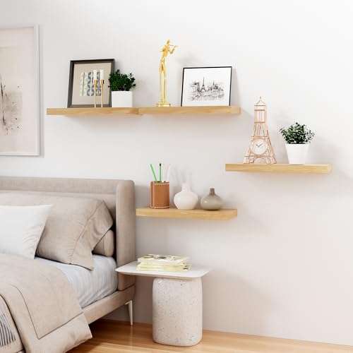 - 【Modern Concise Design】Our white floating shelves are designed with modern simplicity. It has streamlined look to bring modern style and vintage atmosphere to the home. Our wood floating shelves for wall is a set of 4 wall mounted shelves. Our rustic wood shelves can give us plenty of space for creativity, we can choose a line, a ladder shape, or a symmetric way. Let our floating shelf wood more suitable to the home decor and bring a better visual experience.