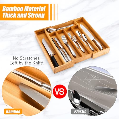 - ✅【Fit your drawer perfectly】Still measuring every kitchen drawer and buying a kitchen drawer organizer of the same size? Our bamboo silverware drawer organizer is designed with 5-7 compartments. Thanks to its adjustable features, our expandable drawer organizer can be expanded from 10 to 15 inch wide, Perfect for any kitchen drawers.
