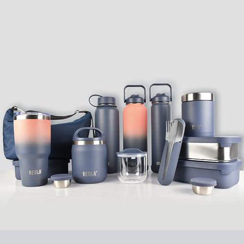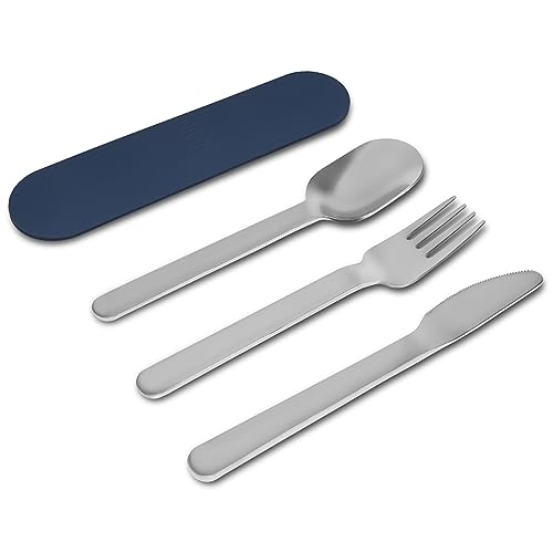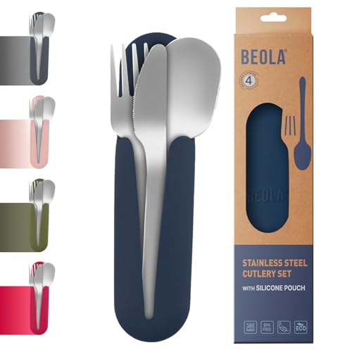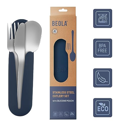 BEOLA - BEOLA Stainless Steel Cutlery Set, Travel Utensils Set with Silicone Case Pouch, Fork Spoon Knife Camping Set, Cutlery Set for Kids School, Set of 4 (Marine Blue)
