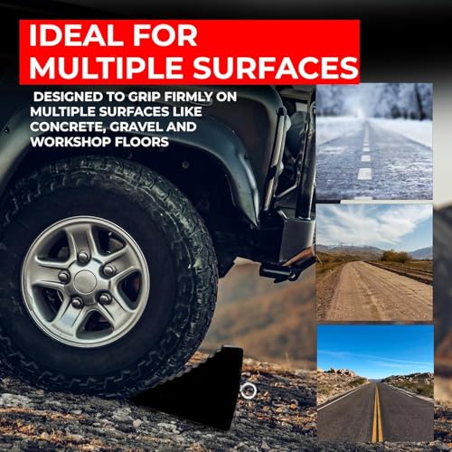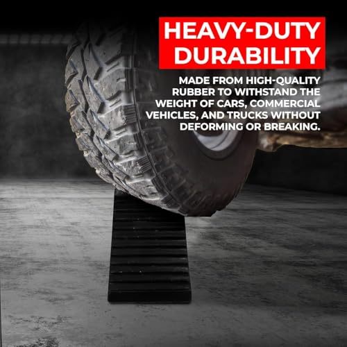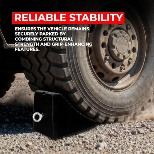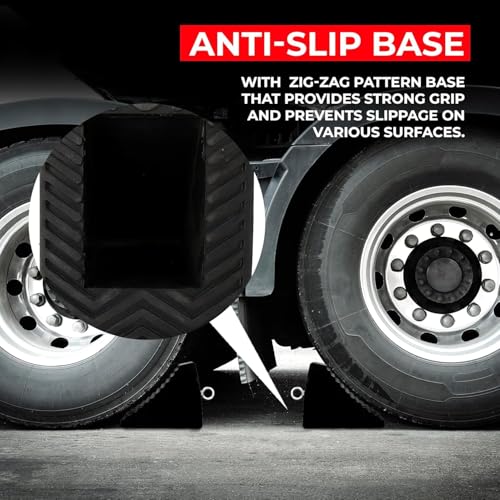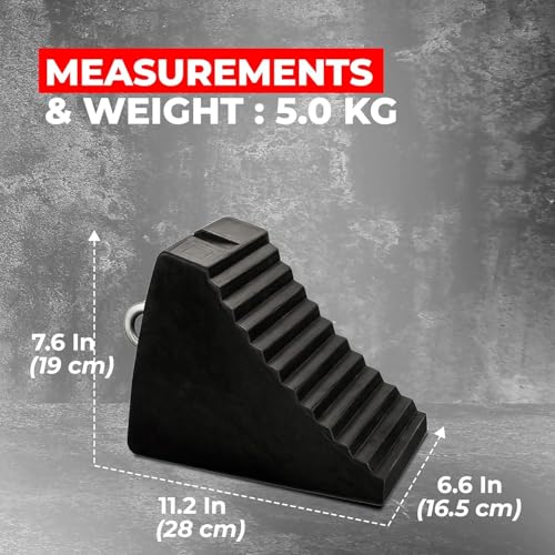 - Features: *- Heavy-duty rubber wheel chocks / tire stoppers. *- Non-slip tread surface for secure wheel stop. *- Portable 5KG compact tire block design. *- Convenient handle for easy placement. *- Suitable tire chock for cars, trucks, RVs, trailers. Specifications: *- Material: Heavy-Duty Rubber *- Color: Black *- Weight: 5 kg per pc *- Portable Handle: Yes *- Surface: Non-Slip Rugged Grip *- Durability: Withstands weight of cars, trucks & trailers *- Design: Compact & portable for easy storage *- Usage: Garages, car parks, workshops, campsites *- Vehicles: Cars, RVs, Trucks, Trailers, Vans