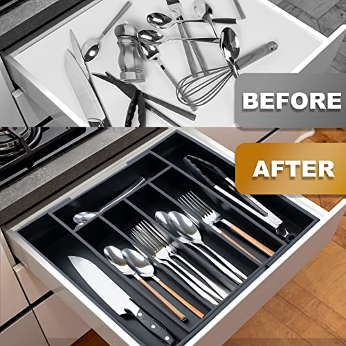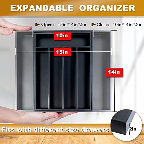 - ✅【Solved Storage Space Problems】Our black bamboo sliverware organizer is an absolute necessity for kitchens everywhere. Designed with 5-7 compartments, the kitchen drawer organizer can for flatware & utensils storage with two additional compartments for larger kitchen tools which can save space while accommodating multiple items. It is worth mentioning that our 10" - 15" wide, 14" long and 2" deep utensils organizer can be expanded from 10 to 15 inch wide, perfect for any kitchen drawers.
