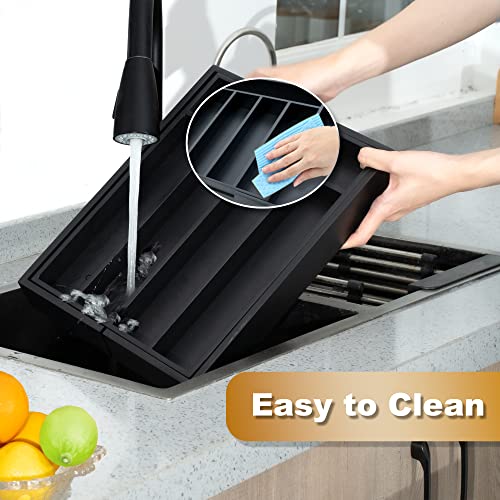 - ✅【Easy to clean and maintain】Our black flatware organizer is made from natural bamboo that have grown for more than 4 years. Bamboo is an exceptional resource that is sustainable, highly durable, and easy to clean. Every adjustable drawer organizer is handmade by senior craftsmen to ensure smooth surface without burrs.Finely polished on all surfaces and gentle for cutlery and utensils. You can safely let your family or children use our silverware organizer.