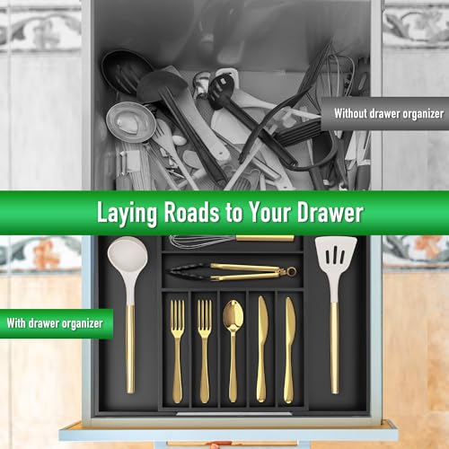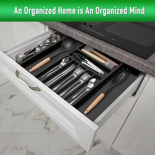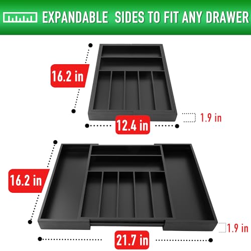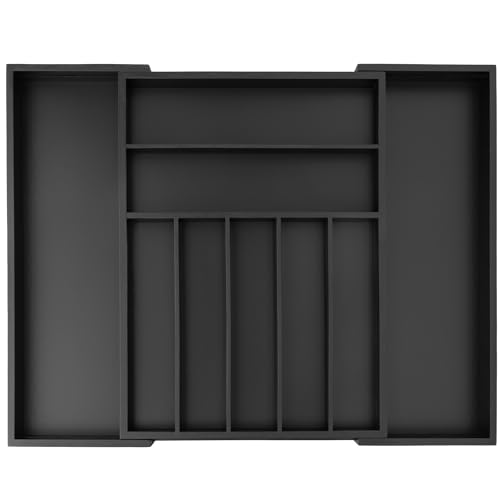 Besilord - منظم ادوات المائدة الفضية من بيسيلورد، منظم ادراج المطبخ قابل للتوسيع من الخيزران الاسود لتنظيم ادوات المائدة والادراج