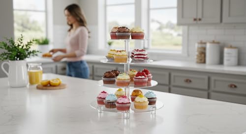 - Elegant 4-Tier Round Design: Features four round plates with polished clear edges — perfect for showcasing cupcakes, cake slices, fruit, and pastries on any dessert table.