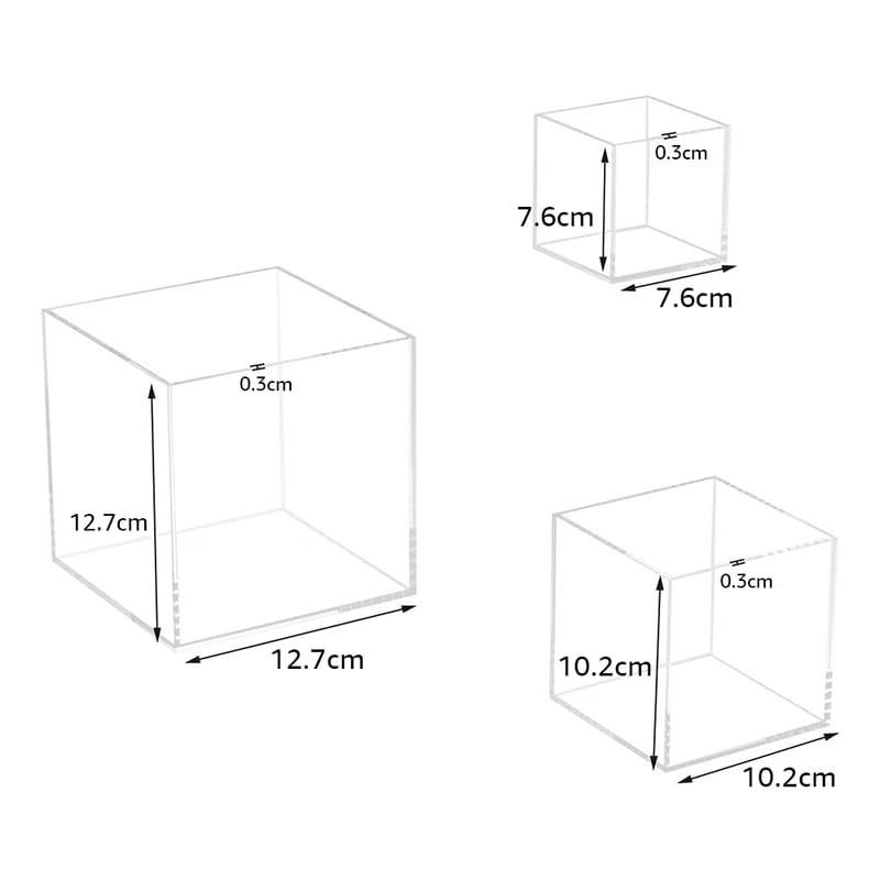 - Versatile 3-Piece Cube Set: Includes three clear acrylic cubes in graduating sizes (4x4x4, 5x5x5, and 6x6x6 inches), providing multiple options for displaying collectibles of various dimensions.