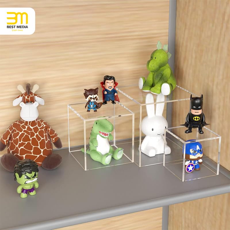 BM Best Media Advertising and Industrial Services - BEST MEDIA 3-Piece Transparent Acrylic Display Box and Riser Set, a 5-Sided Museum Case for Collectibles, Figures, and Models- 10-2-15-2 cm Cubes - Museum - 3-Piece Set - Transparent