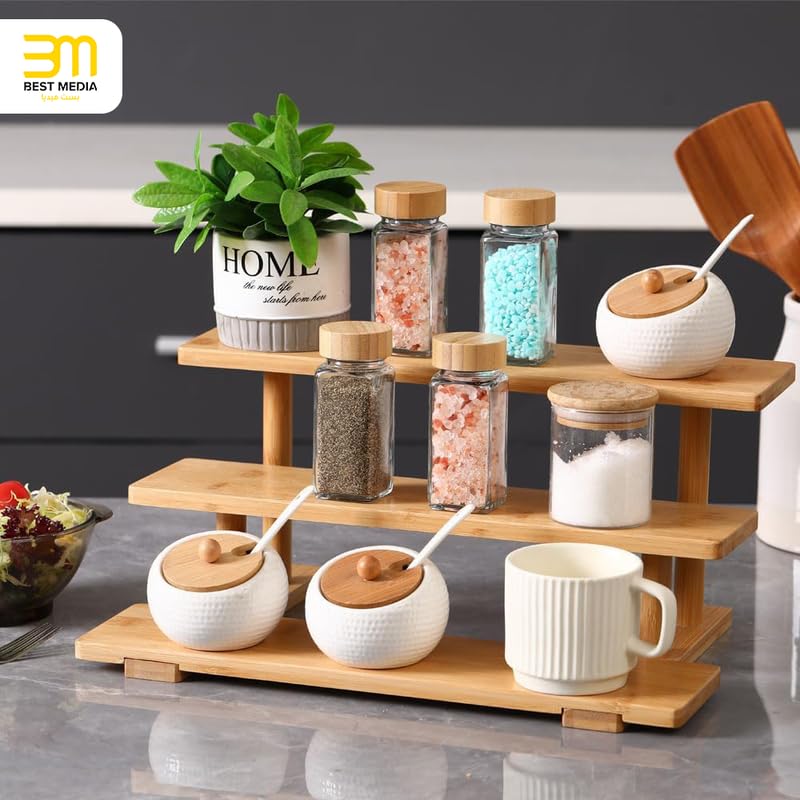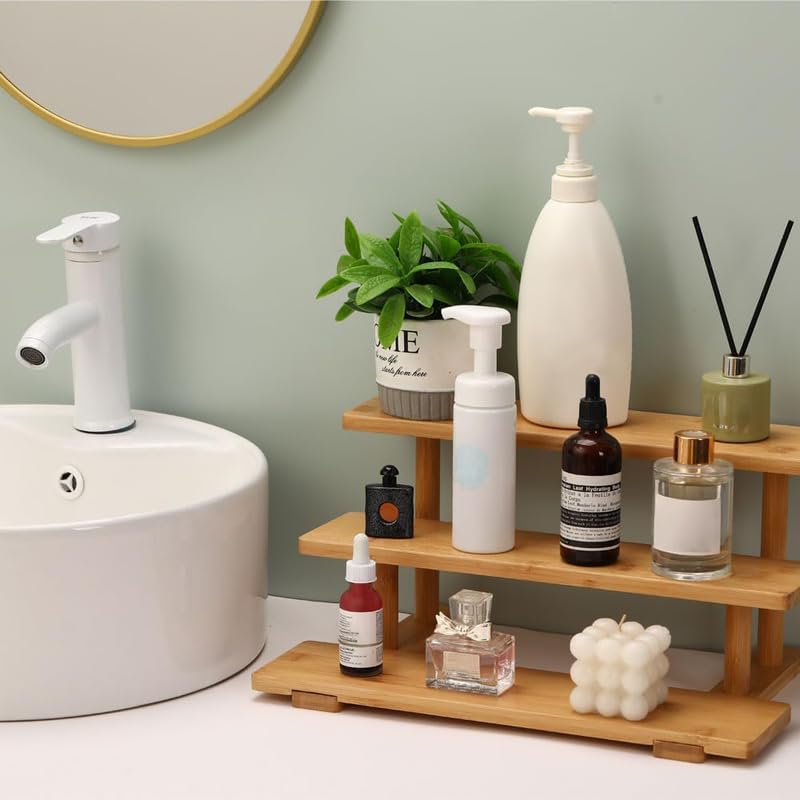 BM Best Media Advertising and Industrial Services - منظم حمام من 3 طبقات من الخيزران من بيست ميديا، حامل عرض العطور ورف خشبي للمكياج واللوشن لمنزلك - صديق للبيئة - قطعة واحدة - خيزران