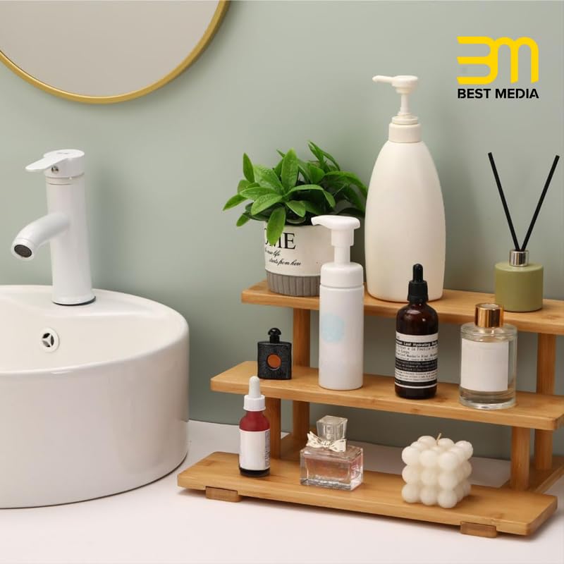 BM Best Media Advertising and Industrial Services - Best Media 3-Tier Bamboo Countertop Organizer, Elegant Display Riser Stand for Perfume, Makeup, and Skincare, Versatile Shelf for Bathroom Vanity, Kitchen Spices, and Collectibles