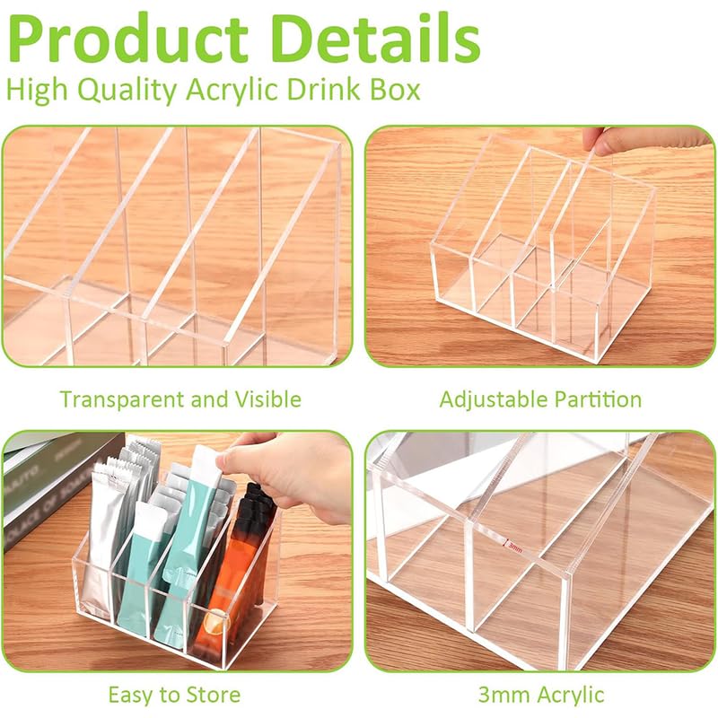 - Customizable Storage with Dividers: Comes with removable dividers to organize drink mix packets, tea bags, or small condiments in separate sections.