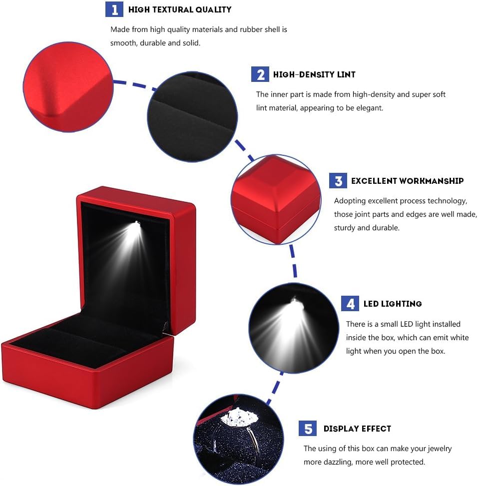 - LED light: the LED light is located in the box of the ring. When the ring box is opened, the LED will light up automatically. The soft light illuminates your jewelry, making your jewelry more beautiful and shiny, perfectly display your jewelry