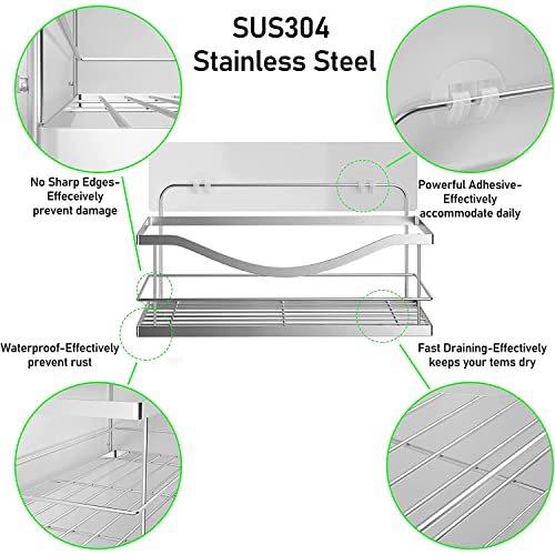 Bestdon - Shower Basket No Drilling Shower Shelf Bathroom Shelf Self-Adhesive Shower Shelf Stainless Steel Bathroom Wall Shelf with 4 Hooks, Brushed, Pack of 2