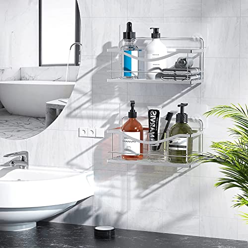 - Strong adhesive and easy installation: the adhesive surfaces are made of a nano material and have extra strong adhesive properties. Therefore, no drilling is required, free from damage to your wall, simply peel off the cover film, attach the adhesive surface to the desired surface and then hang the bathroom shelf.