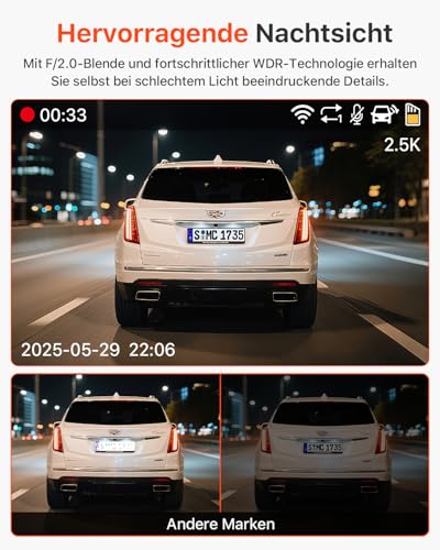 - رؤية أوضح ليلًا مزودة بـ 4 أضواء بالأشعة تحت الحمراء: مزودة بعدسة مكوّنة من 6 طبقات بفتحة F/2.0 وتقنية WDR التي تعمل على تحسين التعريض تلقائيًا في ظروف الإضاءة المنخفضة لالتقاط صور أوضح وأكثر دقة. جودة تسجيل ممتازة توفر أدلة أقوى في حال وقوع الحوادث. بفضل 4 أضواء بالأشعة تحت الحمراء، يمكن رصد السائق والركاب بدقة حتى في الظلام التام.