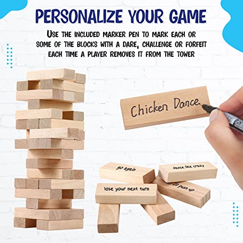 - FUN GAME WITH A TWIST: Can be played as the classic game of skill and accuracy, OR with a twist! We have included a Pen for you to personalised each block with an exciting forfeit or dare. You can also use the dice to determine the number of blocks to remove without it tumbling! Whatever the occasion, this is definitely an exhilarating game to play and a great icebreaker too! How long can you go without the tower or you collapsing?