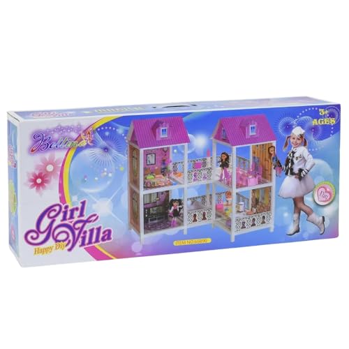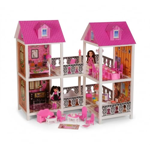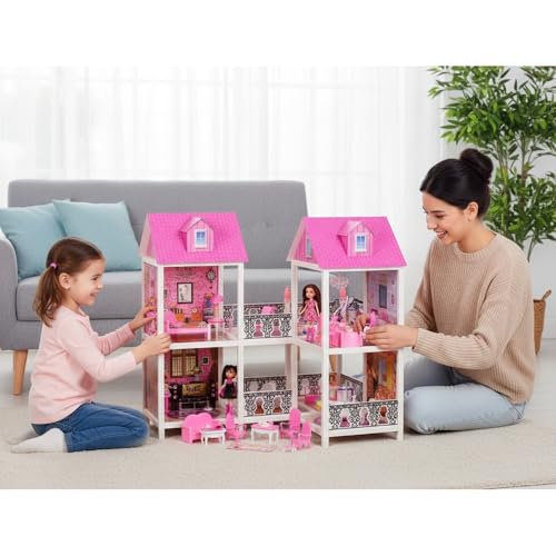 - IMAGINATIVE PLAYSET: Two-story villa dollhouse with pink roofs, multiple furnished rooms, and connecting balcony area that encourages creative role-play and storytelling for children.