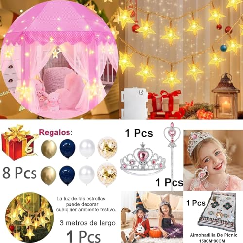 Beyson - Beyson Portable Girls and Boys Tent - Princess Castle with Rectangular Picnic Pad + Crown and Wand + Star Lights + Balloons, Tents House (Pink)