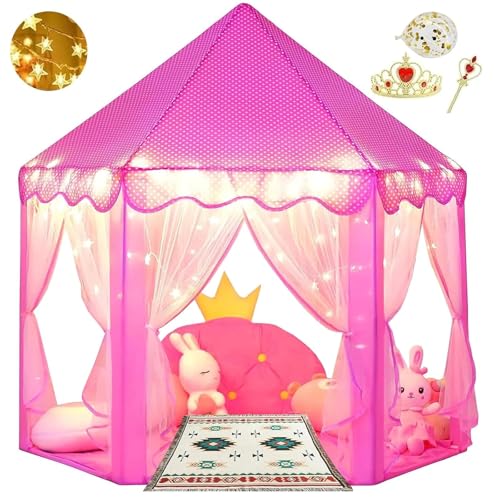 - 【Play and Relax in a Princess Castle】: This princess tent is a small castle for little princesses to play, read and relax in their private space and have fun and have good time with their friends. Package includes: 1 x Princess House + 1 x Rectangular Picnic Pad + 1 x Wands and Crown + 1 x String Lights 3 Metres (20 LEDs, without battery) + 8 x Balloons + 1 x Bag.