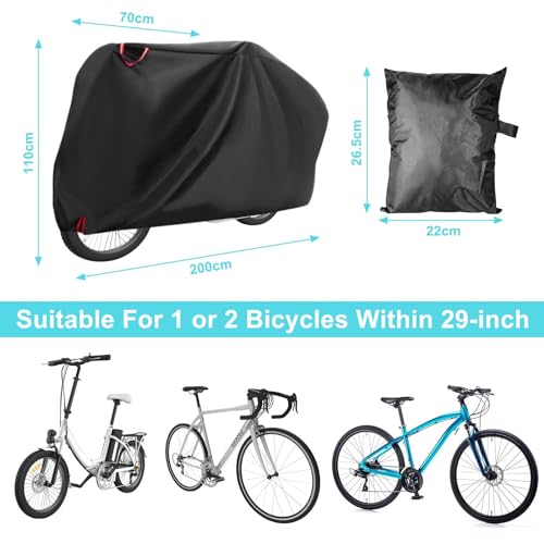 - Large size: the 200 x 110 x 70 cm bicycle protective cover easily accommodates 1-2 29 inch bicycles next to each other and ensures that they are fully protected. Ideal for mountain bikes, road bikes, hybrid bikes, e-bikes and more. (Please measure your bike before ordering)