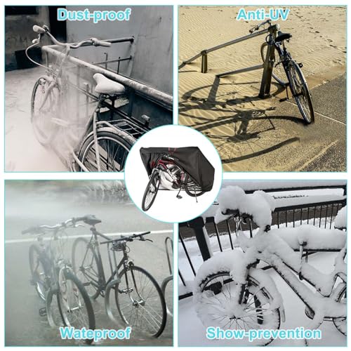 - High quality, water and dustproof: the bicycle protection is made of high-quality waterproof polyester fabric. Even in rainy, snowy, dusty environments or strong ultraviolet sunlight, your bike is well protected. This bicycle tarpaulin is not only effective enough to withstand the elements, it is also scratch-resistant and ensures that your bike stays like new.
