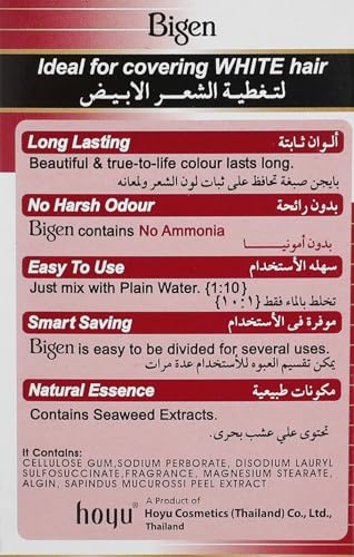 - التفاصيل: صبغة الشعر الدائمة من بايجن مثالية لمن يبحثون عن تغطية كاملة للشيب بنسبة 100%، أو لتعزيز لون الشعر الطبيعي وإبرازه بشكل أجمل.