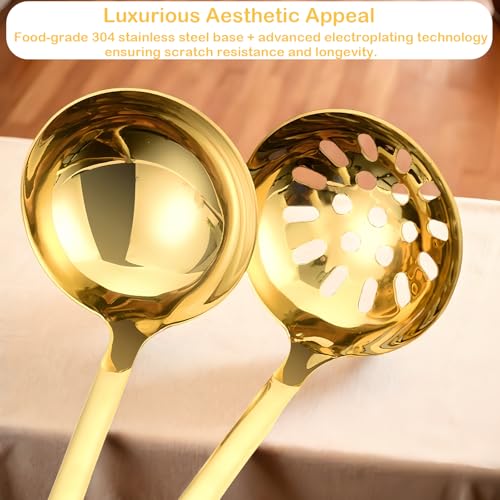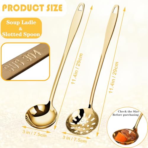 Bigwinyep - Soup Ladle Slotted Spoon Set, 304 Stainless Steel 12.2Inch Metal Ladle, Extra Large Soup Spoon with Long Handle for Serving, Cooking, Stirring, Serving Soups, Gold