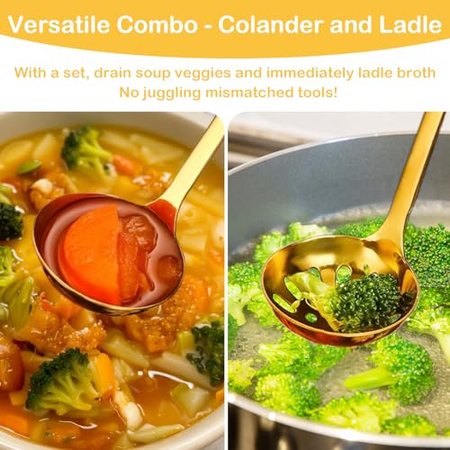 - 2-in-1 Versatility: Soup Ladle and Slotted Spoon,the stainless steel soup ladleeffortlessly serves broths and sauces,while theslotted spoon for cookingstrains solids like meats, veggies,or noodles. Together, they streamline tasks like servinghot potdishes,stirring stews,or draining pasta