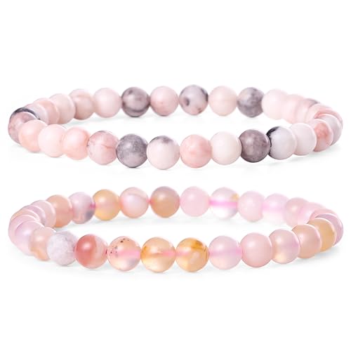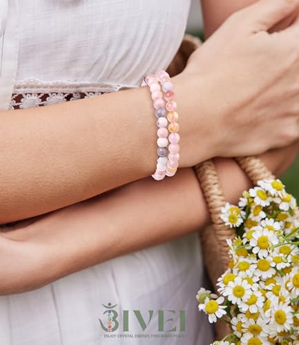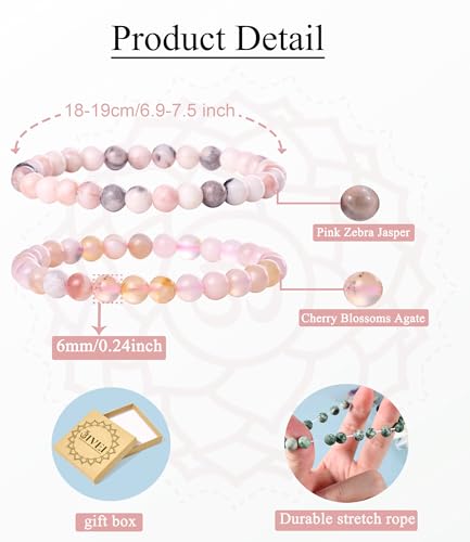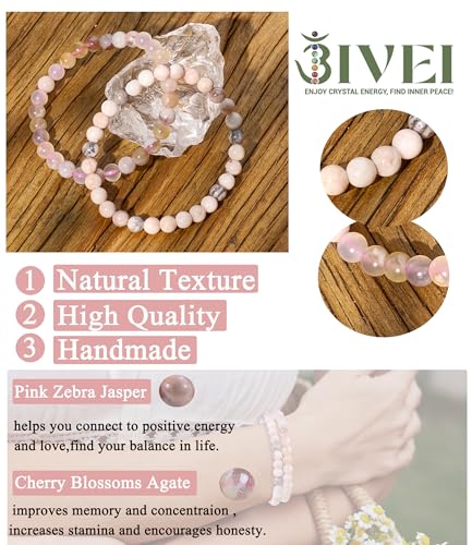 Bivei - Bivei 6mm Rose Quartz Beaded Bracelets Natural Healing Crystal Stone Pink Zebra Jasper Cherry Blossoms Agate Round Beads Stretch Bracelet for Women Anxiety Stress Relief Gifts