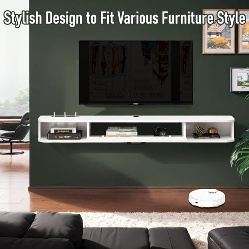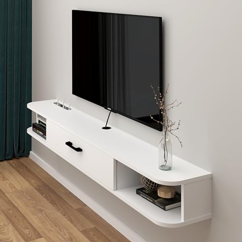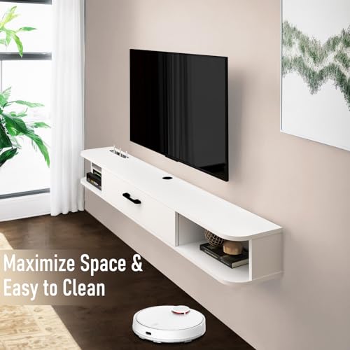 - [Stylish & Safety] Floating tv unit can be arbitrarily matched with various furniture. Smooth and simple design will add elegance and vitality to living room. Anti-collision design with rounded corners can protect your family and children.