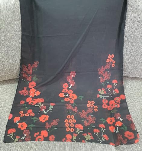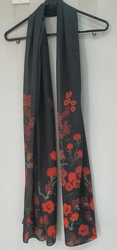 Pretty Spring - سكارف شيفون باللونين الأسود والأحمر مزين بورود الجوري، مقاس 2 متر × 70 سم